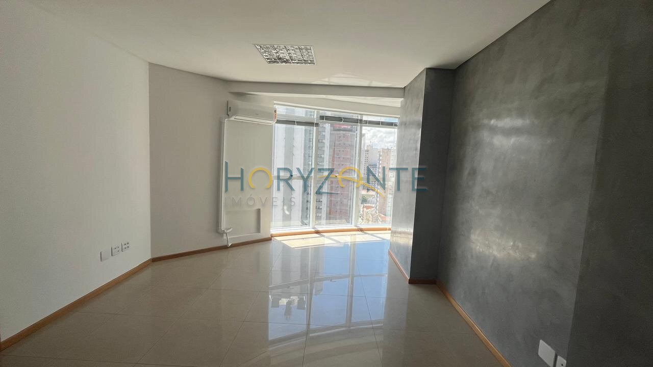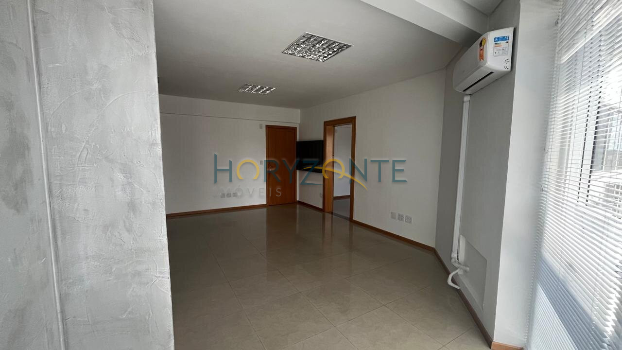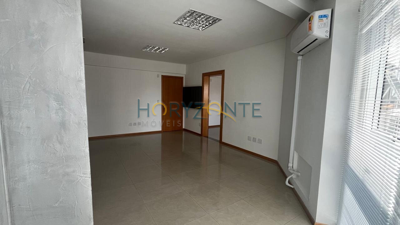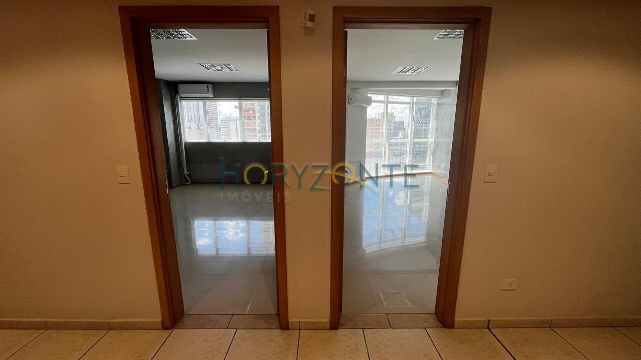 Duas salas comerciais contíguas, totalizando 48,5m², com ar condicionado instalado, luminárias, persianas e piso em porcelanato.