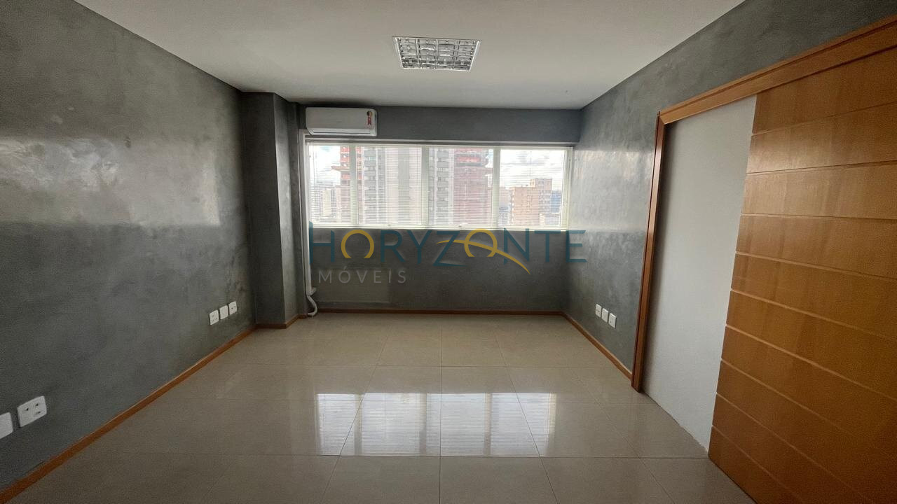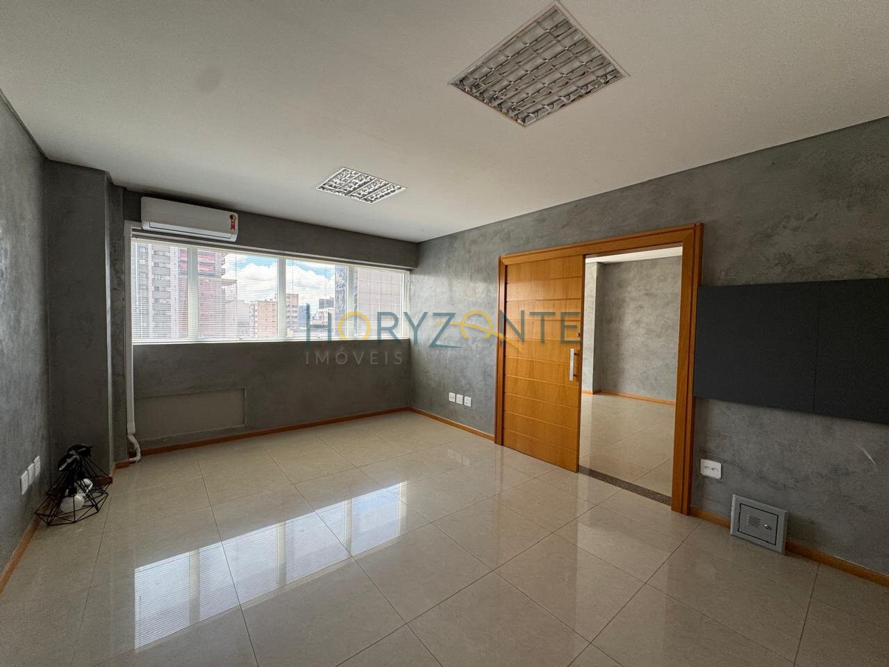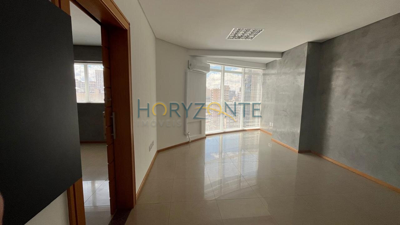 Duas salas comerciais contíguas, totalizando 48,5m², com ar condicionado instalado, luminárias, persianas e piso em porcelanato.